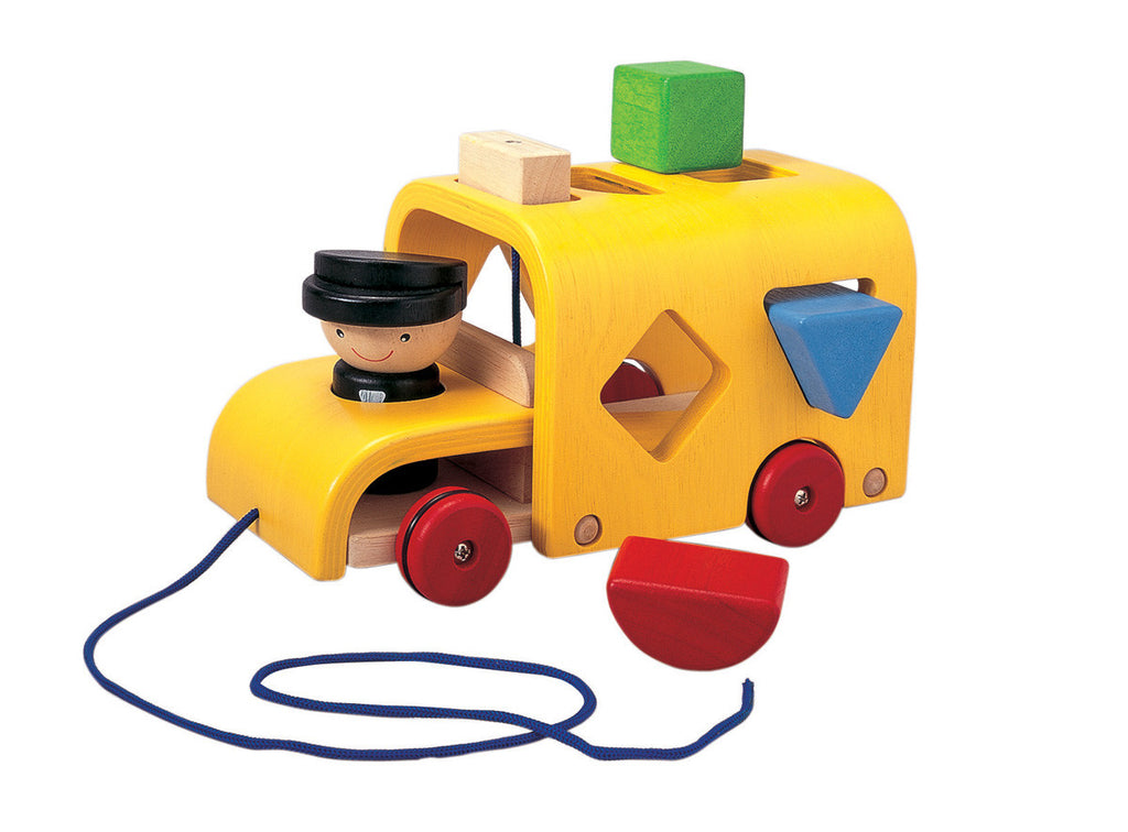 The shape sorting bus contains shapes that when sorted correctly will fit into the bus. Pull the sign on the bus and all the pieces will slide out.